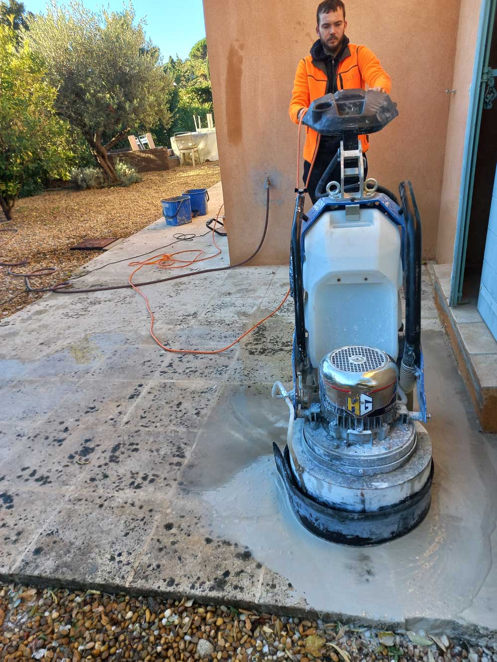 Le ponçage des sols comme le marbre, le béton ou autre pierres naturelles consiste à remettre (ou mettre) le sol complètement plane et d'enlever toutes les griffes ou autres altérations. Avec le temps le sol subit de nombreuses agressions, mécaniques et chimiques, celles-ci seront complètements gommés par le ponçage. Selon les besoins, une couche de quelques dizaines de millimètre sera poncée. Cette opération ne met nullement la solidité de la pierre en danger. Les trop gros trous ou éclats seront mastiqués afin de ne pas enlever une trop grosse couche du sol.Aprés plussieurs passage avec different grains de diamants et pierre nous aboutirons à une surface qui aura retrouve toutes sont integrité et sont aspect originel avec une finition qui pourra être soit mat ,adouci,satinéé ou poly brillante en fonction du support et de vos envies .l' opration de ponçage sera finalisé par un traitement adapté(durcissement par minéralisation ,traitementhydo oleofuge ,..) afin de rendre perenne dans le temps la restauration de votre materiaux.